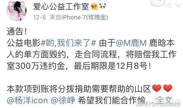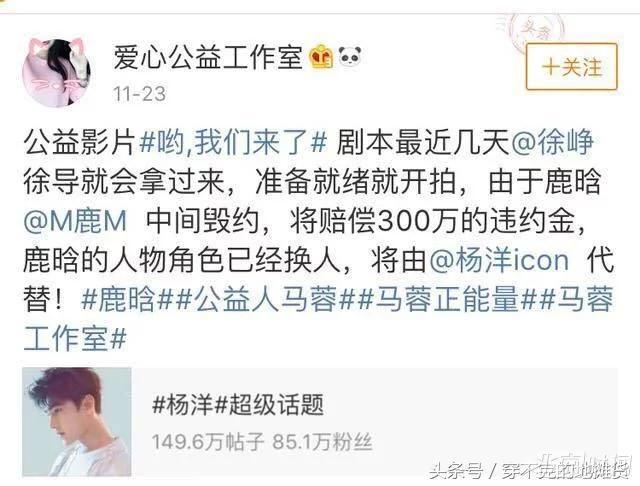 前段時間,馬蓉拿來炒作的公益片《喲,我們來了》,現(xiàn)已傳言是由鹿晗主演,鹿晗地下發(fā)表聲明:馬蓉是誰?當(dāng)機(jī)立斷就詆毀了。馬蓉發(fā)微博聲明鹿晗將補(bǔ)償300萬的違約金,然后夸張?jiān)撈瑢⒂谛鞃槄f(xié)作。隨后徐崢馬上廓清此事!